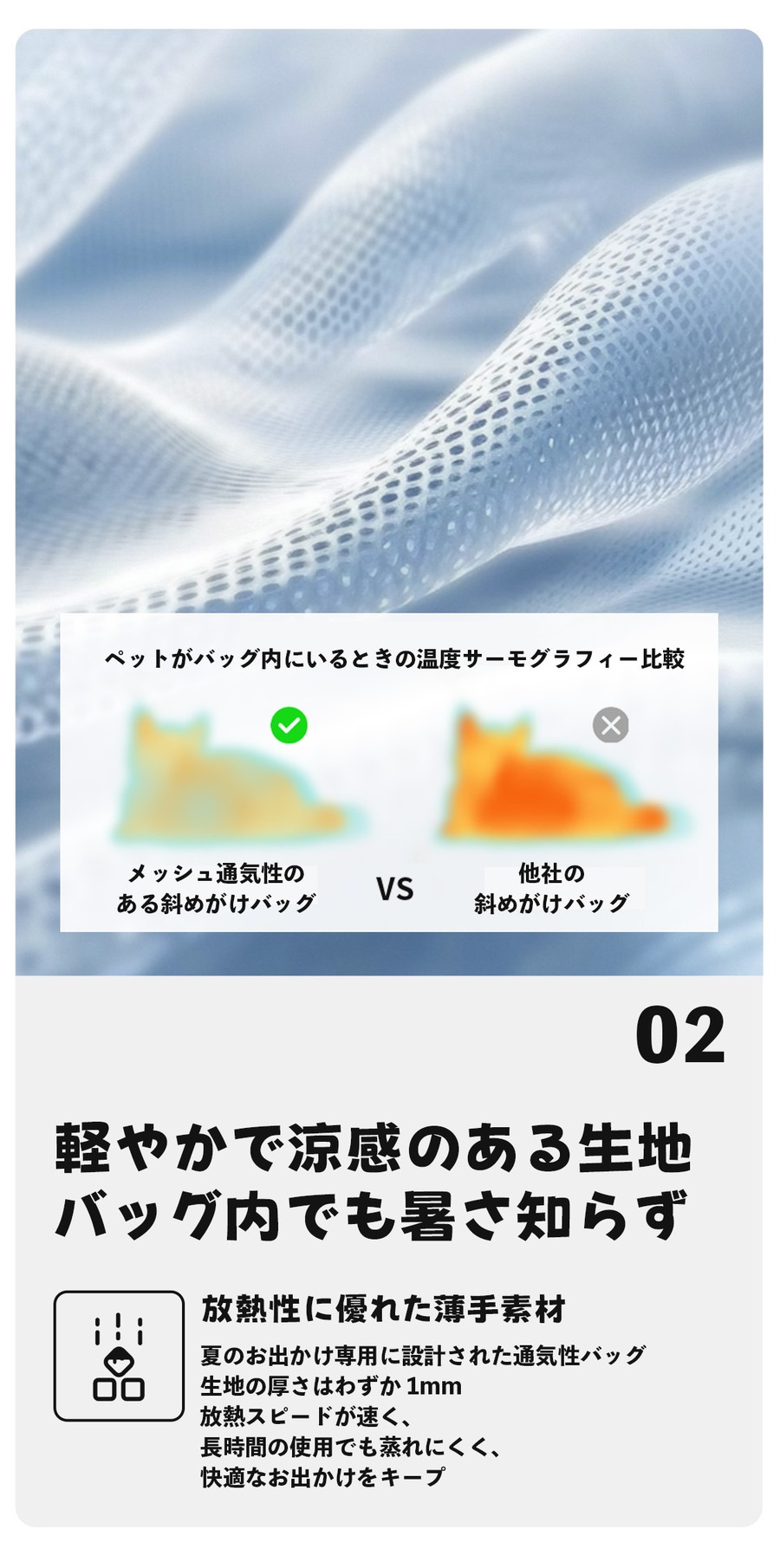 ■軽くて通気性に優れた、ナイロン&高密度メッシュ素材の斜めがけペットバッグ。